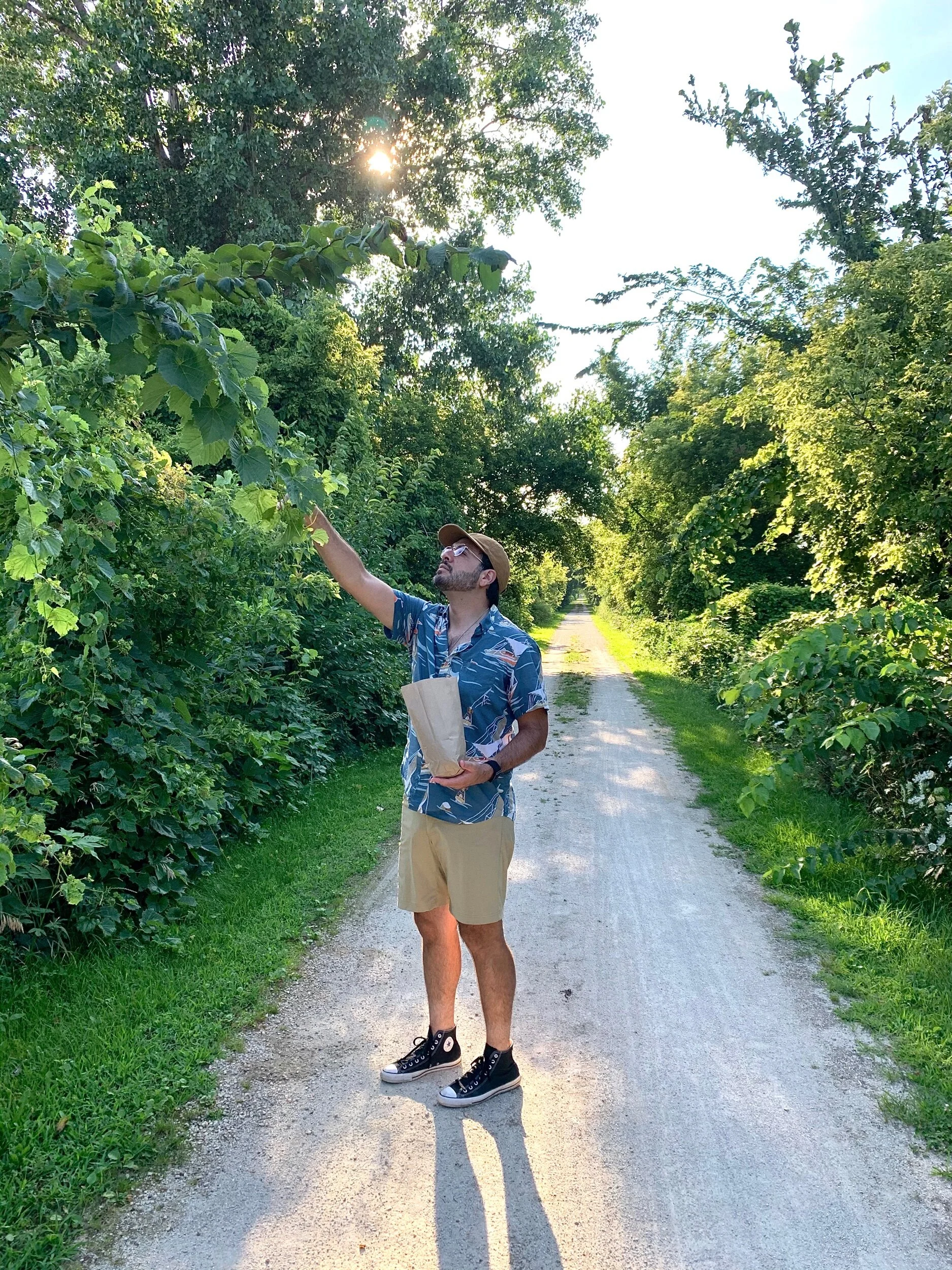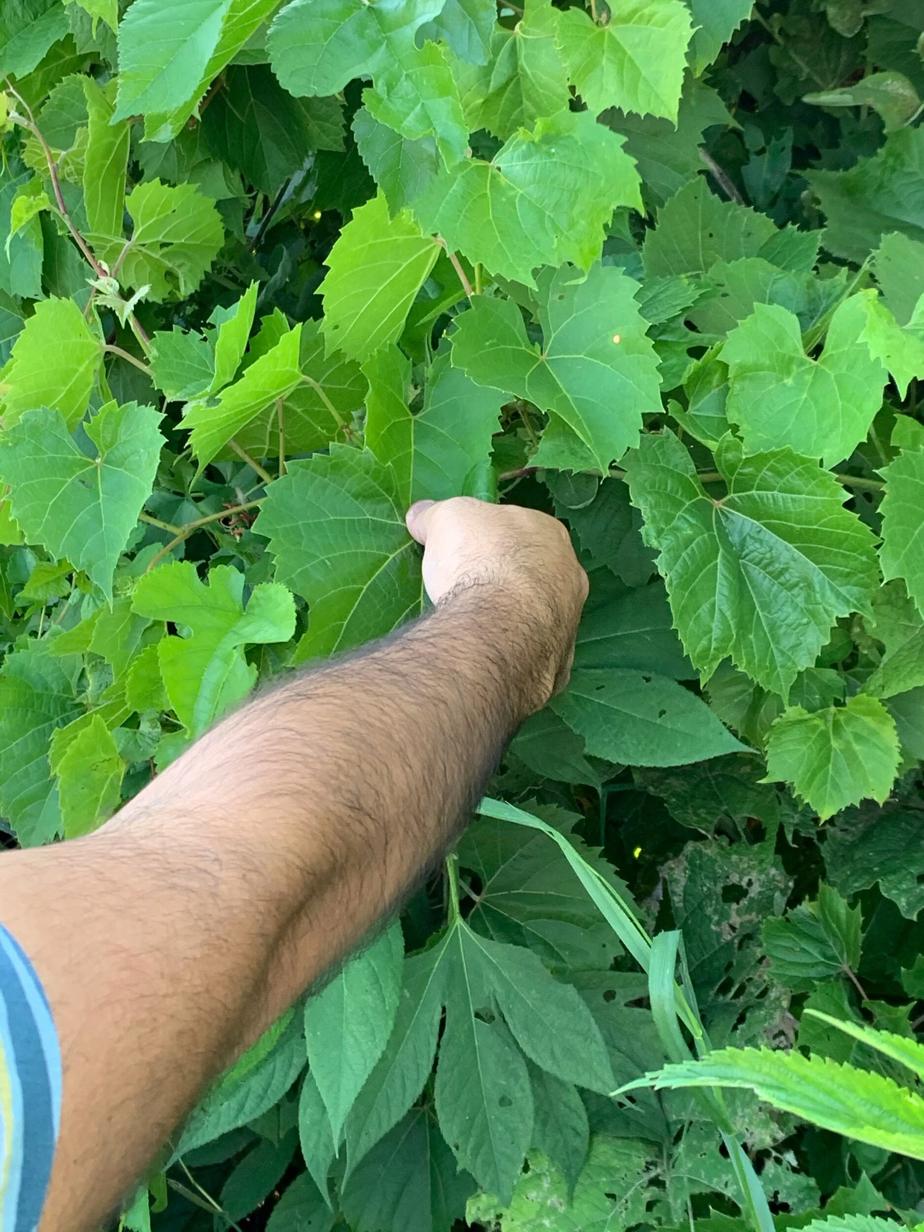 We watched Amy Schumer’s newest documentary, “Expecting”, and Evo bought her husband’s cookbook, “The Beetlebung Farm Cookbook by Chris Fischer with Catherine Young”. It had a recipe for pork sausage-stuffed dolmas that Evo wanted to try. So out we went to forage wild grape leaves!