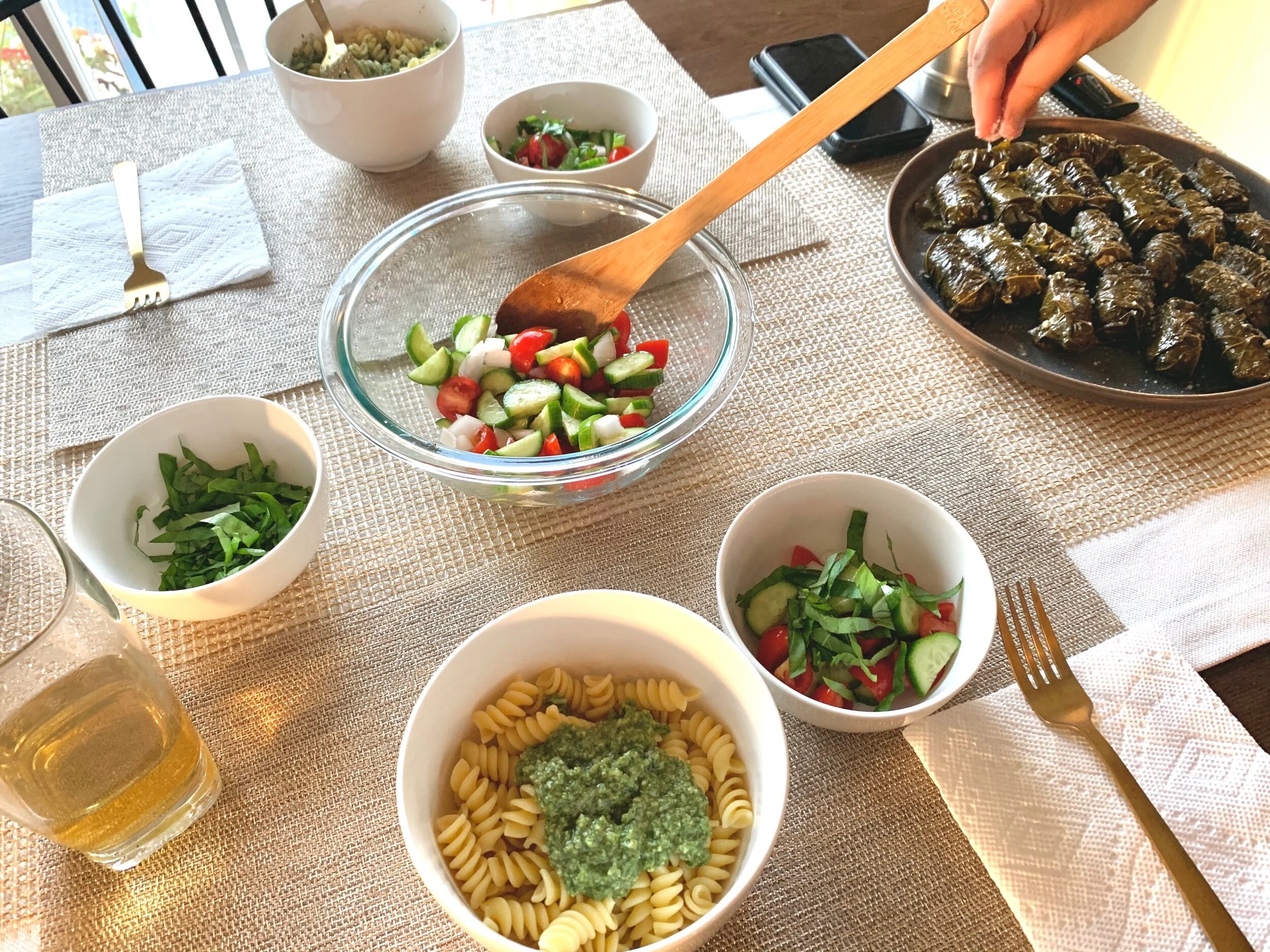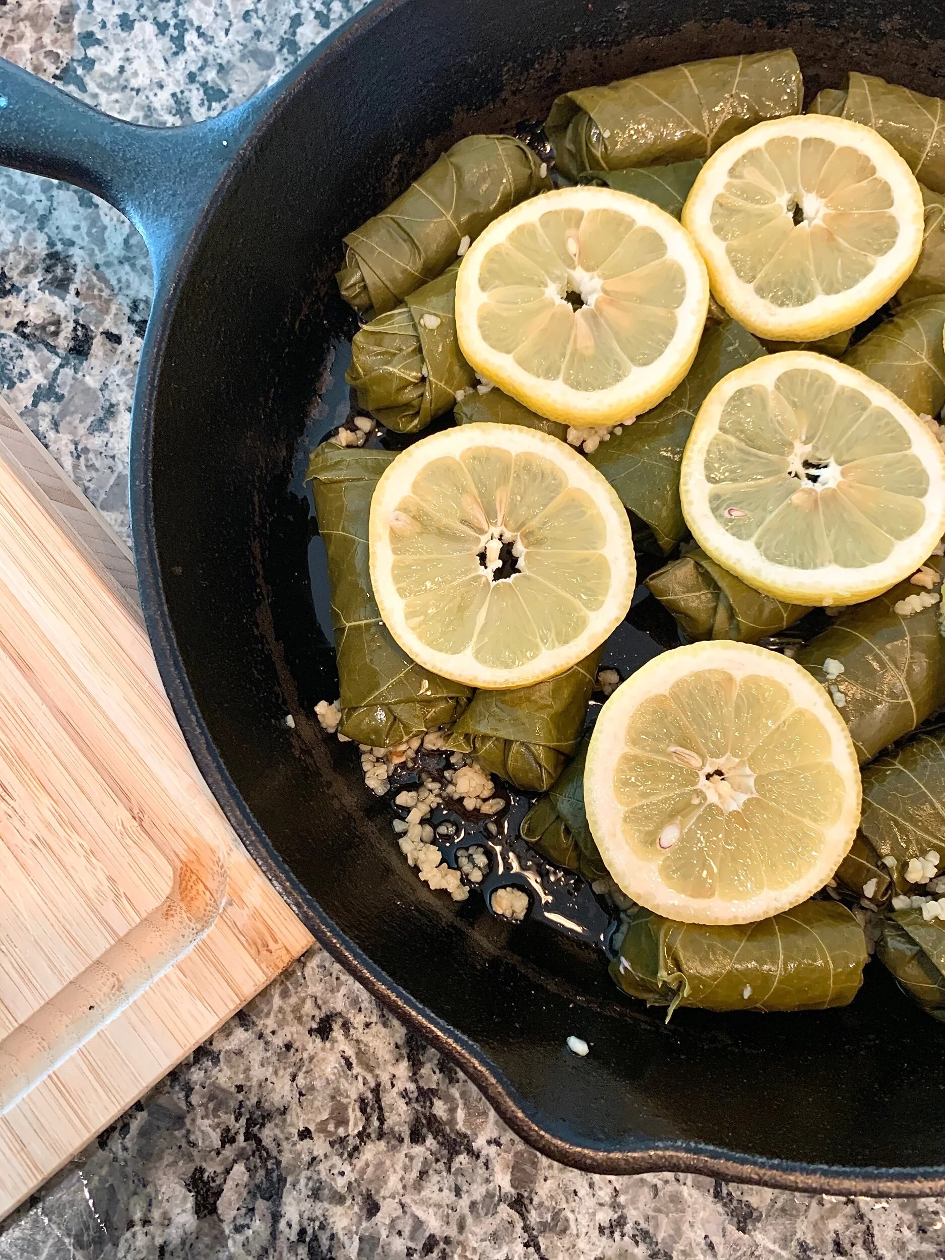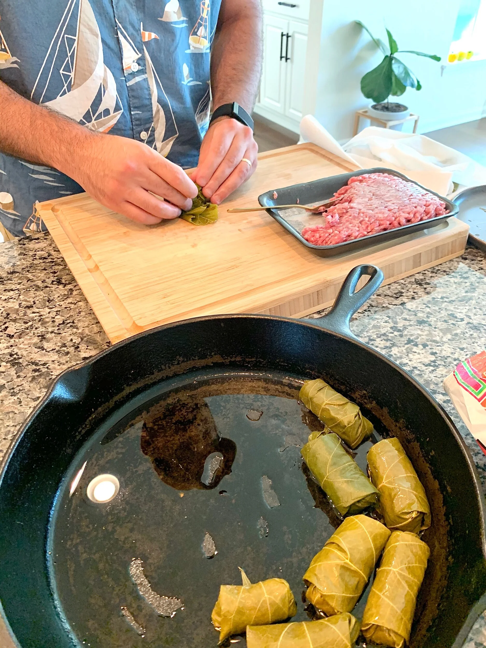 Then the fun began! One by one, Evo rolled a small amount of ground pork into a grape leaf and rolled it up. After they were all rolled and placed in our cast iron pan, he topped them with olive oil, garlic, and sliced lemons then put them over medium heat on the stove top. He covered them and cooked for a few minutes on each side.